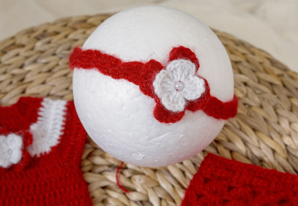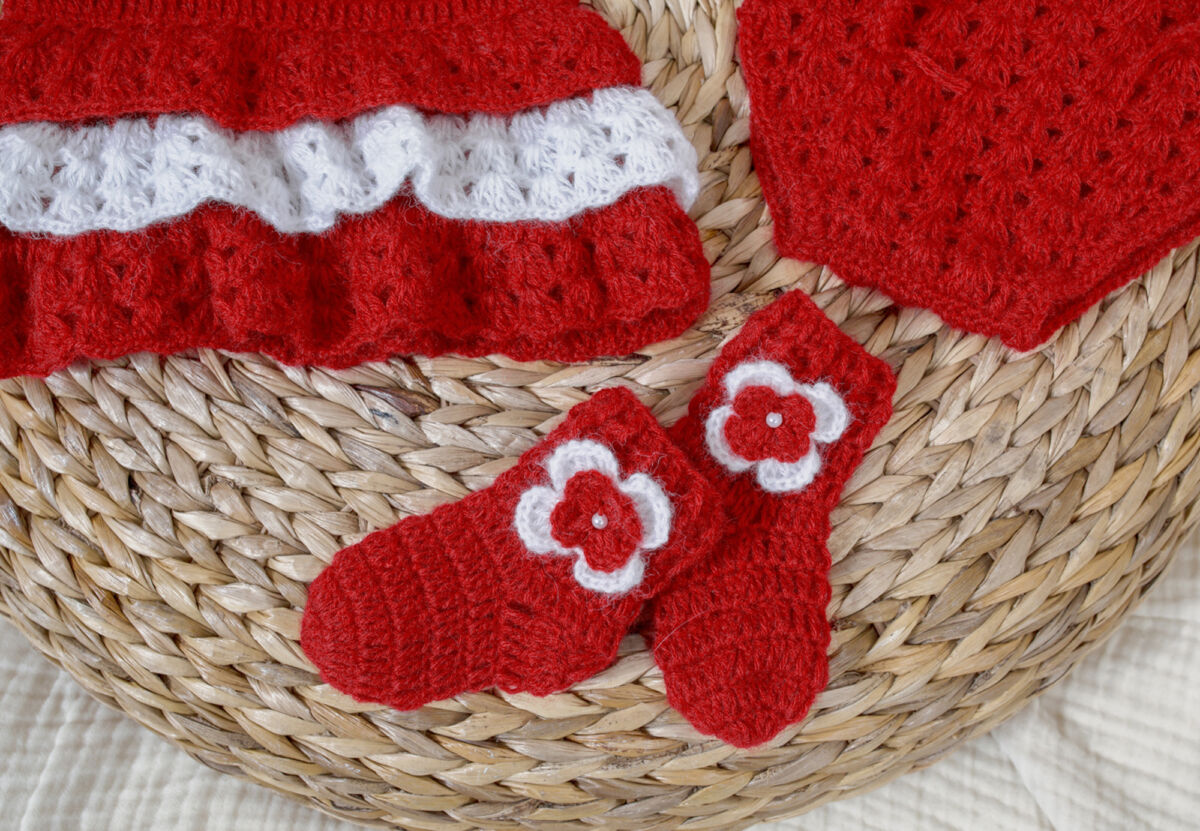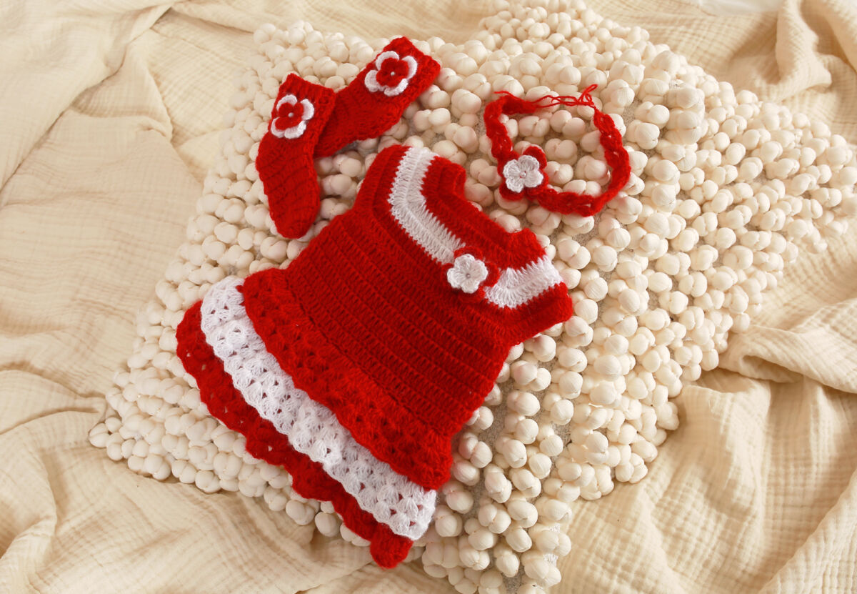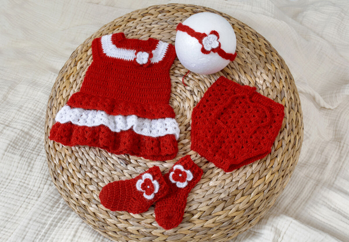 Neugeborenen Häkel Kleid Set mit dem passenden Höschen, Söckchen und Haarband für Mädchen.