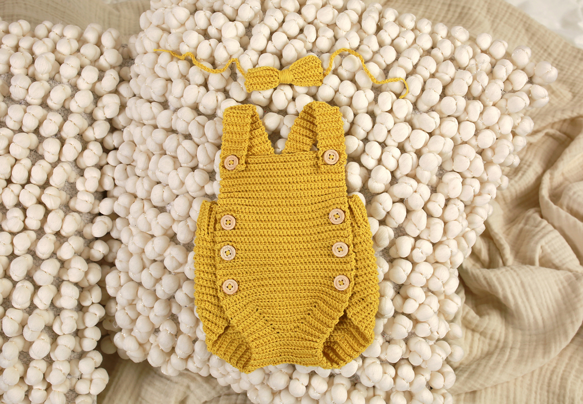 Liebervoll handgefertigtes neugeborenen Strampler mit Haarband oder als Fliege nutzbar wurde aus kuscheligem 100% Baumwolle Wolle gehäkelt.