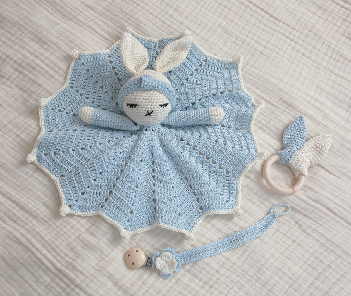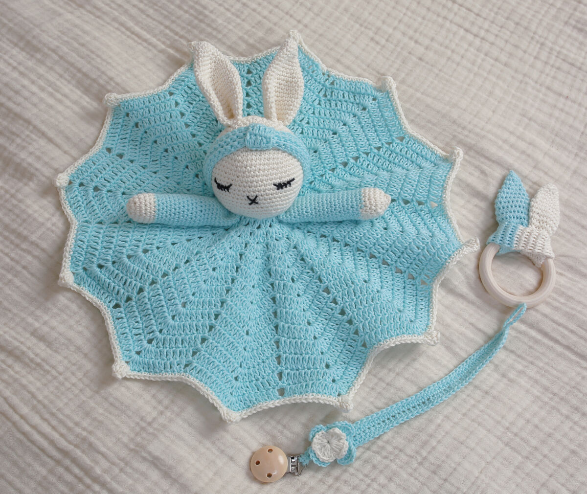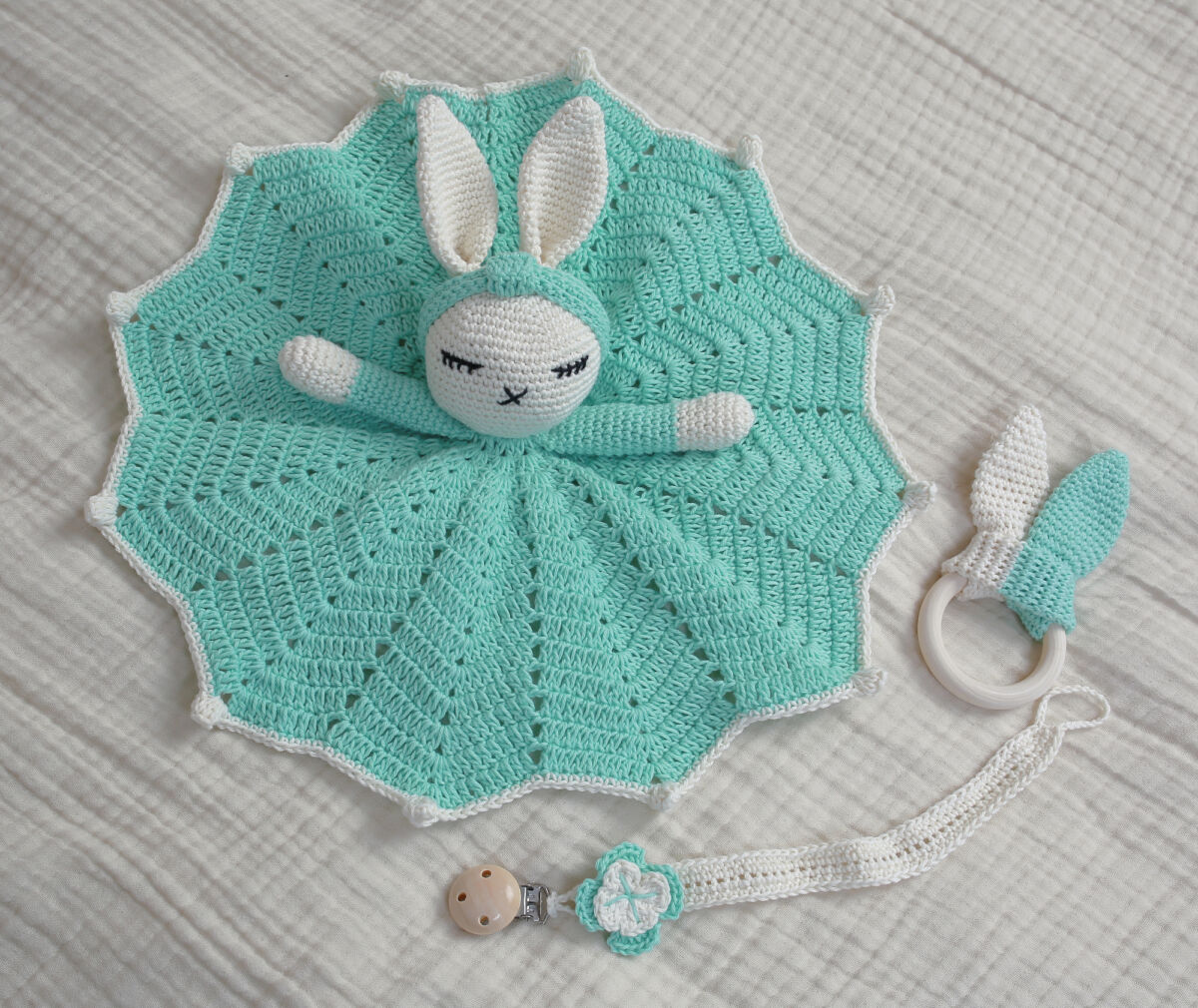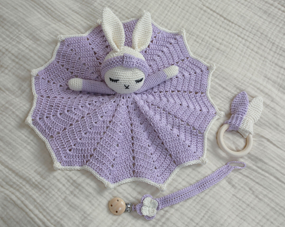 Länge Schnullerkette ca. 22cm ohne Clip. Größe Schnuffeltuch ca. 42 x 42 cm.